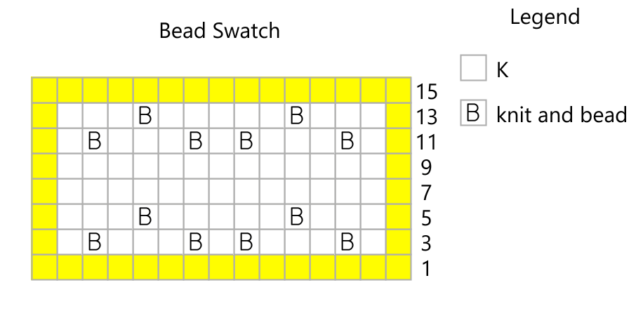 For Rows 11 and 13, knit the stitch and then place the bead.
