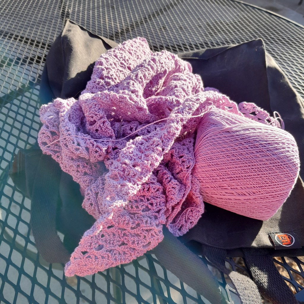 I’ll keep working on it and eventually it will get done. The goal, aside from a bed spread in honor of my Grandmother, is to make it into a teaching opportunity about swatching, gauge and how to use a pattern that say “chain a number…” Also how yarn weight and hook size make a difference in the size of the finished piece.