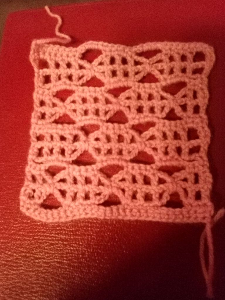I wrote up the directions and sent them to my Mom. She worked it p up using fingering weight yarn and a US “D” crochet hook. Below is her swatch.