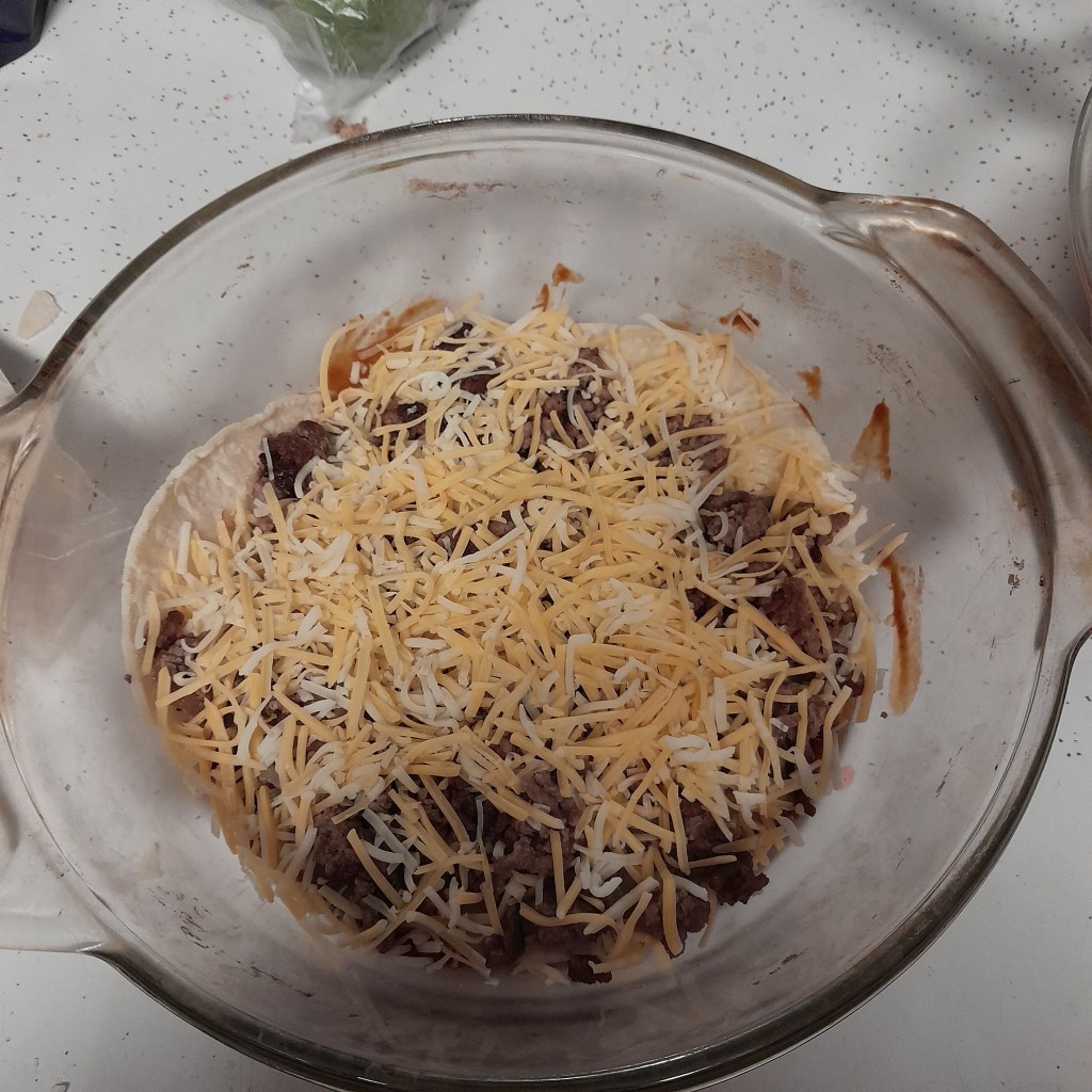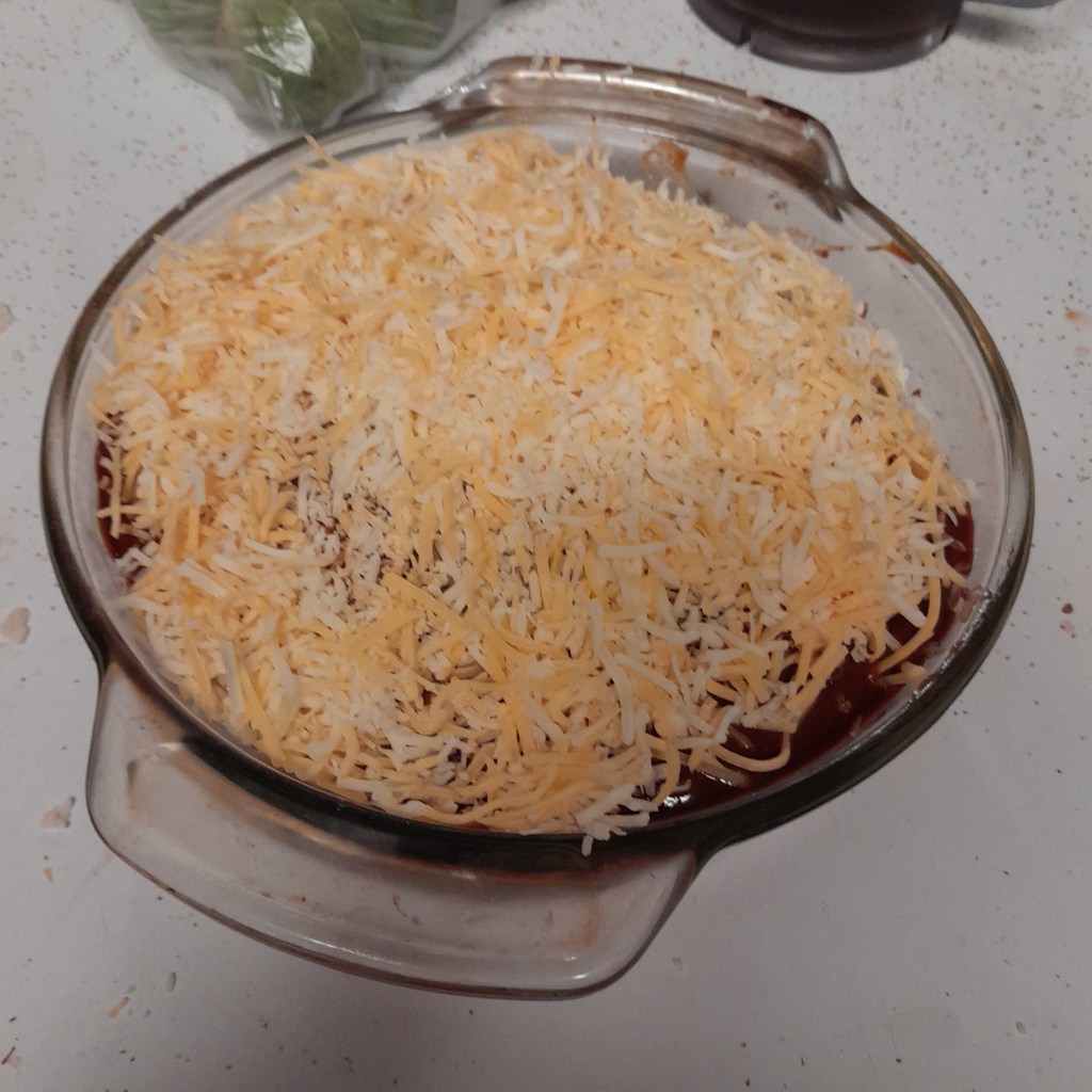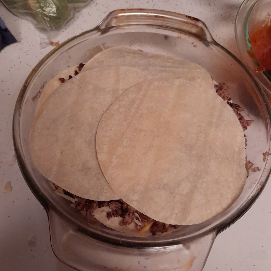Coat the bottom of the pan with a layer of sauce. This helps it not stick so much. Layer 3 tortillas in the bottom. Layer of meat, about 1/3 of the mixture. Layer of sauce, just enough to cover. Layer of cheese, about 1/4 of the cheese. Keep doing this until the top layer is the last 3 tortillas. Cover in as much of the remaining sauce as will fit in the pan, top with remaining cheese.