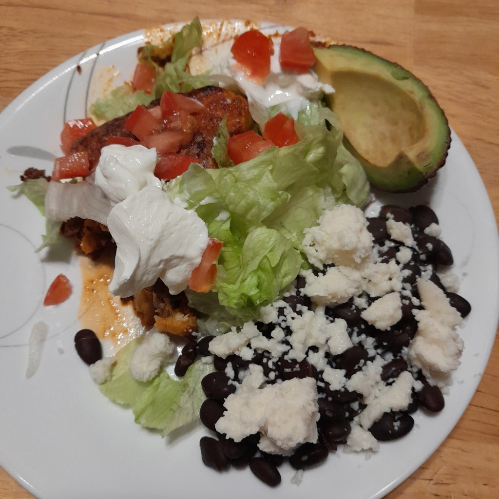 Serve with black beans, queso fresco, lettuce, tomatoes and sour cream.