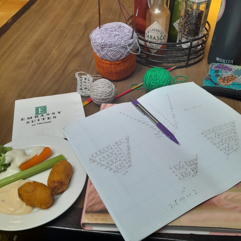 Yesterday after teaching Estonian lace at Yarnfest I grabbed my bag of design bits I brought with me and headed back downstairs to work on this swatch yet again.