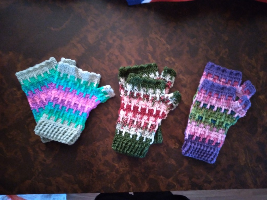 I had enough yarn to make all the pieces, just not as a cohesive set. This set started with the mitts and grew from there.