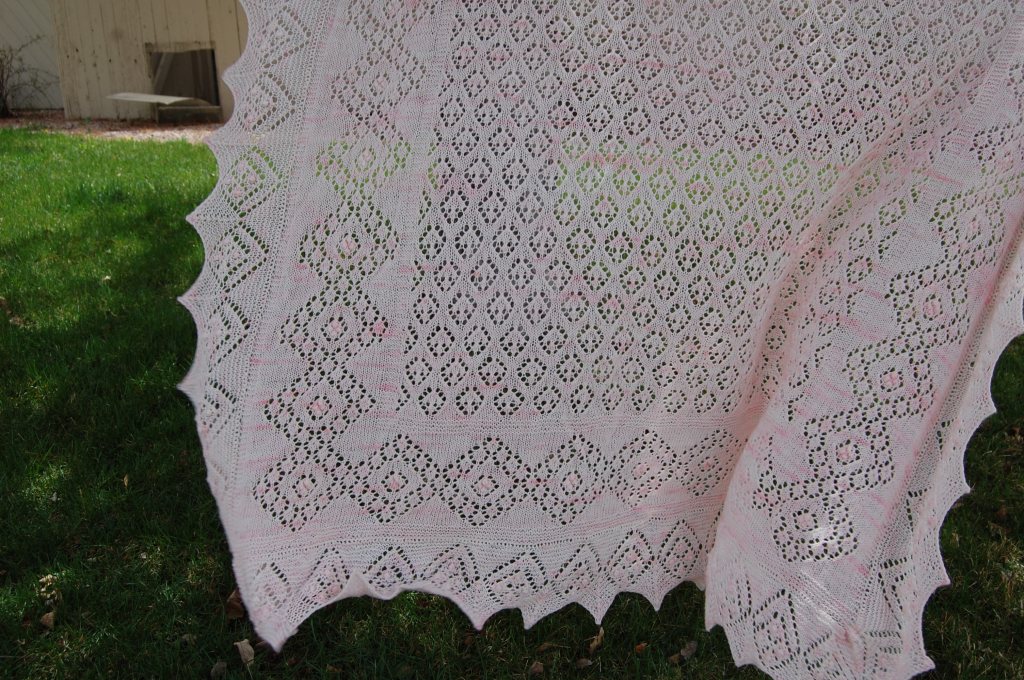 It is a wonderful pink color, on the lighter side. I chose it because it was the original color of the Sophie shawl. That one I dyed the yarn for using Kool-Aid. It was to mimic the color of the pink blossoms on the chokecherry trees. I ordered a similar hue, though it is a good solid and not at all heathered like my original color.