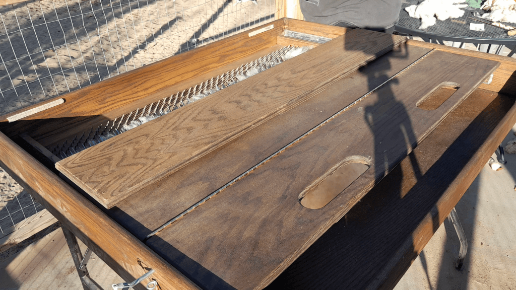 When the fleece is dry, I put it through the picker. This is used to open up the fleece and prepare it for carding. It also removes more vegetable matter.