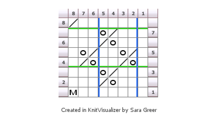 This photo and it’s chart below are an example of lace knitting. This motif is the first border in from the edging.