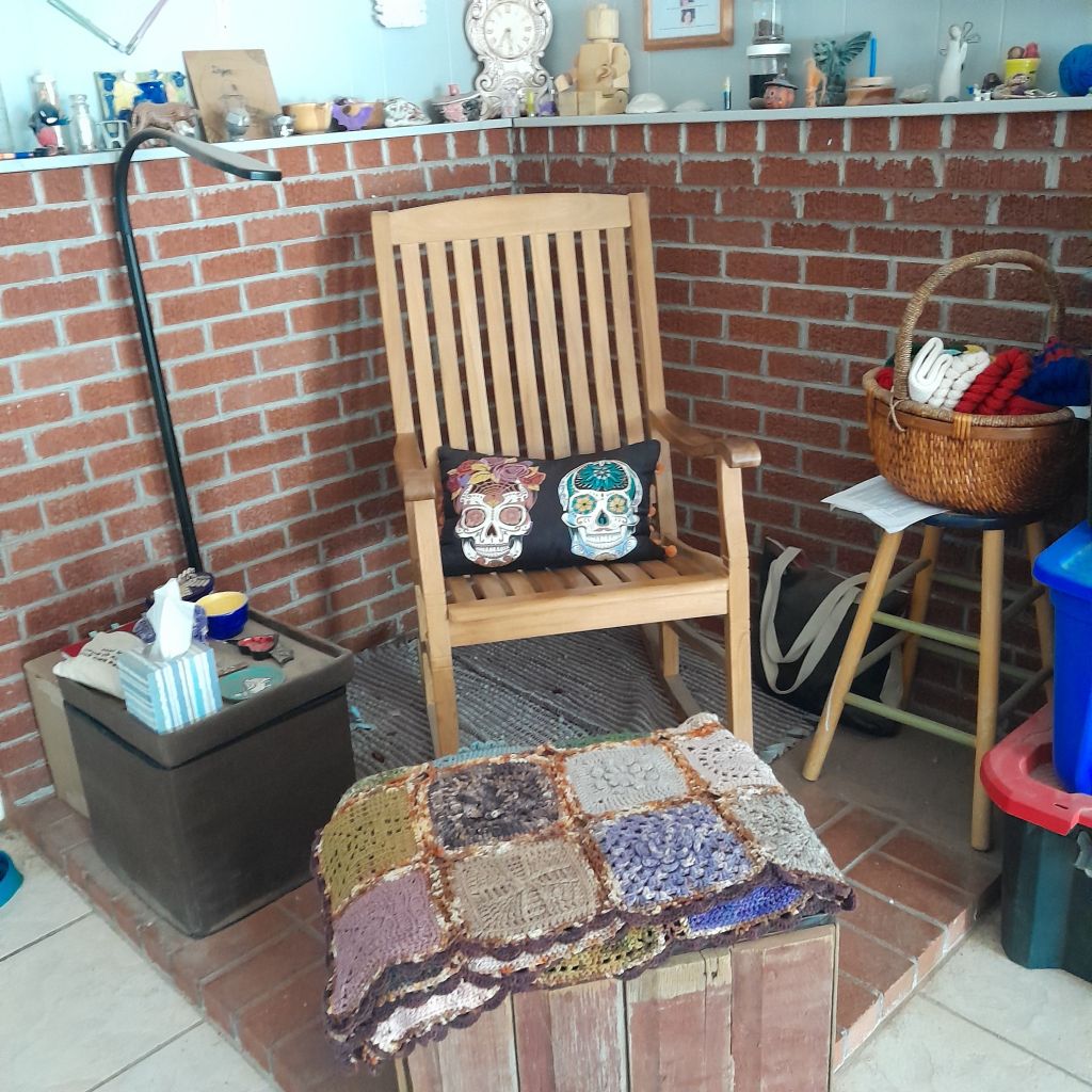 If you are a monogamous stitcher, may I recommend that you add just one more project? Chances are the one project that you have going isn’t mindless stitching. Sometimes it is but if you are growing as a stitcher it won’t be. Those type of projects take a different level of mental focus but they also require more from your body than the mindless stitching does. Have one project that is more difficult and requires more of you and have another that requires very little of you. Something that you can stitch and not look at the entire time. A garter stitch scarf, a single large granny square blanket… I have a lace project that I work on no more than twice a day, for no more than 45 minutes in each session. Yarn overs, nupps, decreases and reading the chart, it is mental and physical. I keep a simple ribbed baby hat going for church, dinner out or other similar situations. For evening stitching while spending time with my husband, either in front of the TV or outside on the bench I have currently have a crocheted beanie that is all half double crochets.