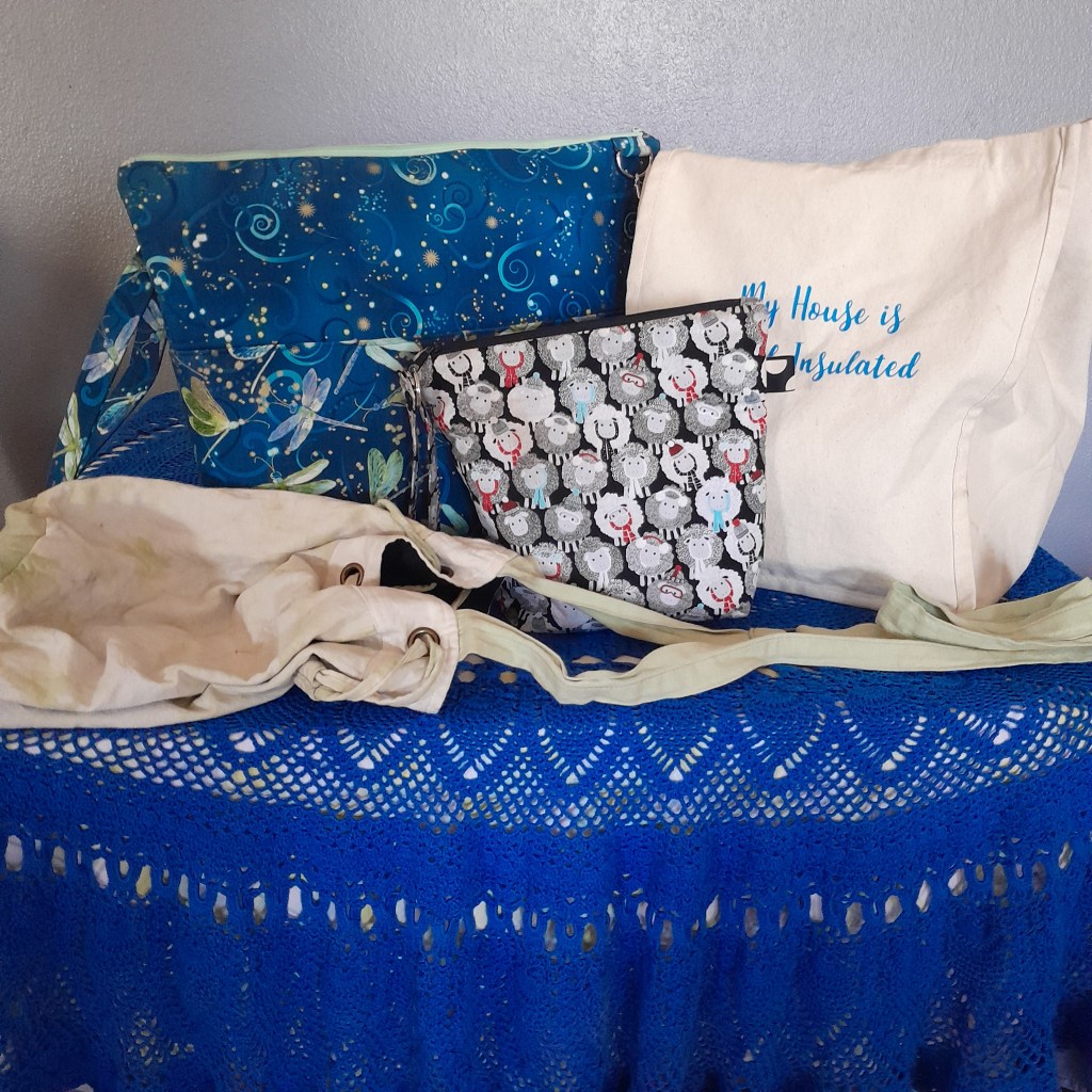On my most recent road trip I had the bag above in the front seat, the canvas bag, pictured in the photo below, easily accessible in the trunk so I could place finished items in it and get more yarn and the blue bag in the back seat. I’ll start with talking about the blue bag.