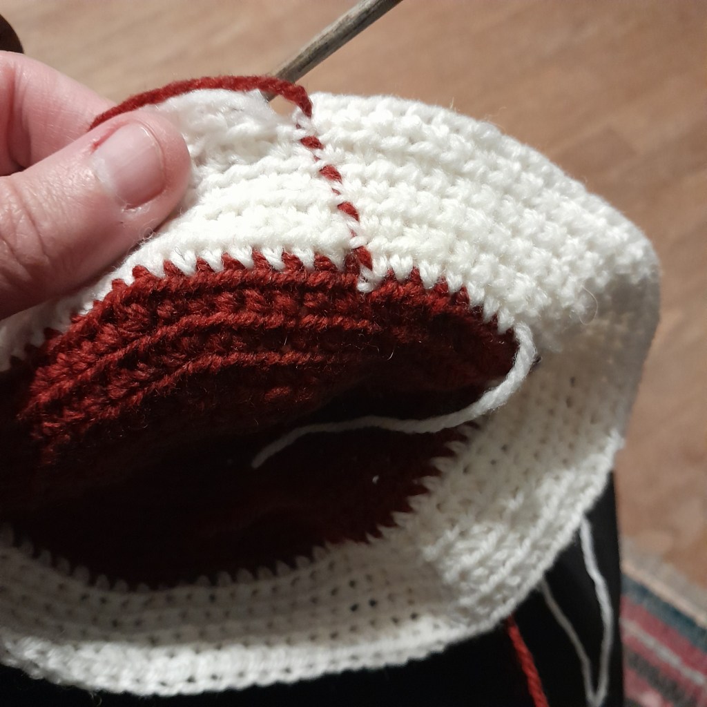 In the photo above I have carried the crimson yarn while working the white rounds. I carried the crimson over five half double crochet rounds. Six rounds is about as far as I would want to carry another yarn when working half double crochets. If I am working double crochets it’s about four rounds.