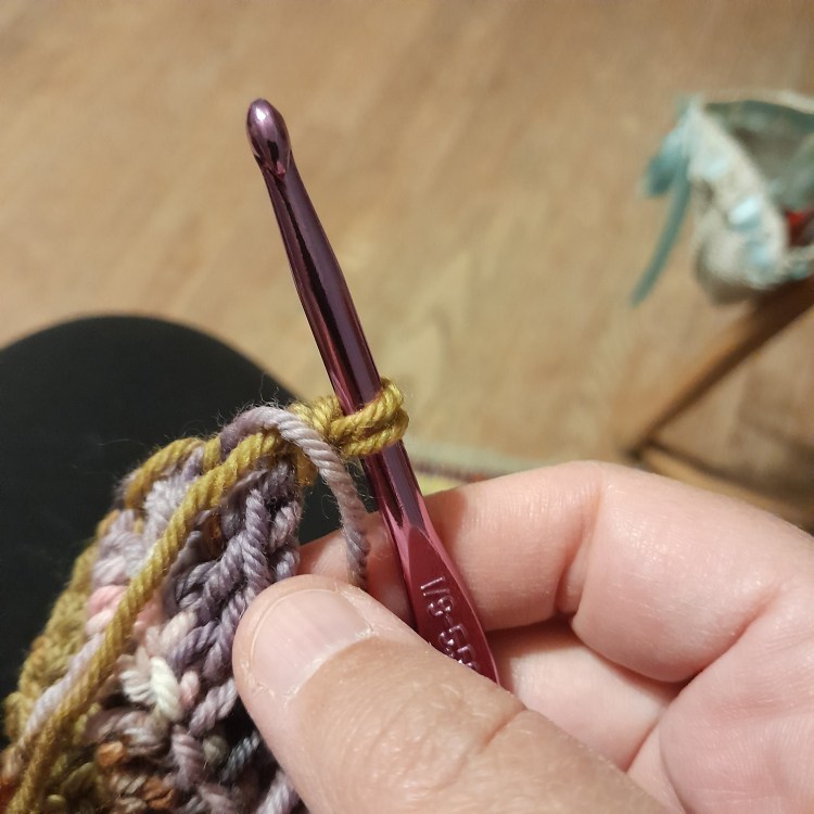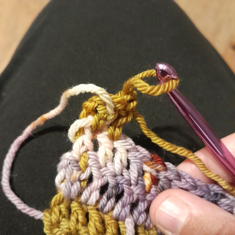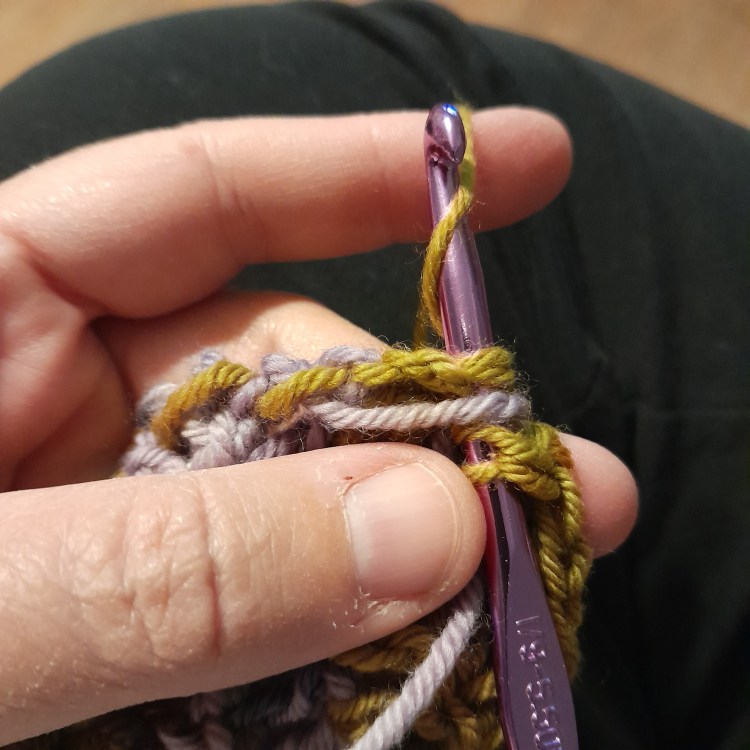 Here you can see that I have finished the double crochet and the green yarn has been captured in the base of it.