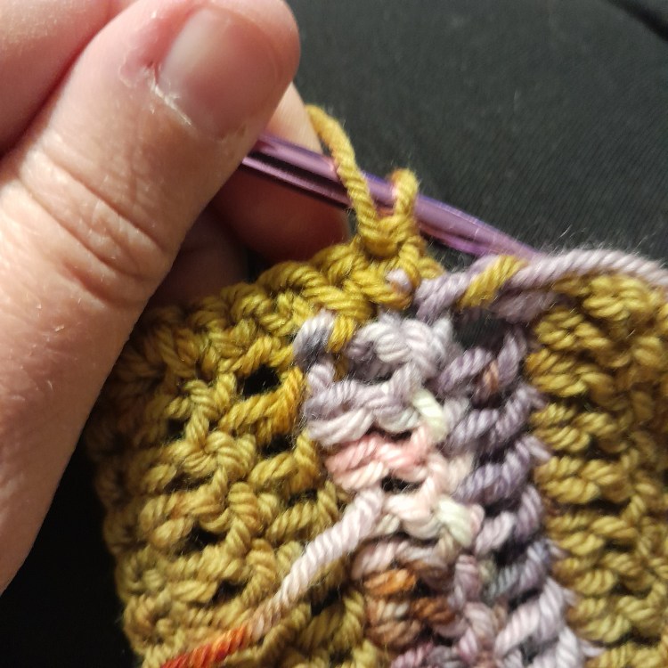 Bring the carried yarn over the hook again and finish the stitch. If the stitch is a single crochet, you won’t need to work the second step. If the stitch is a treble crochet or larger repeat the second step until you have finished working the stitch.