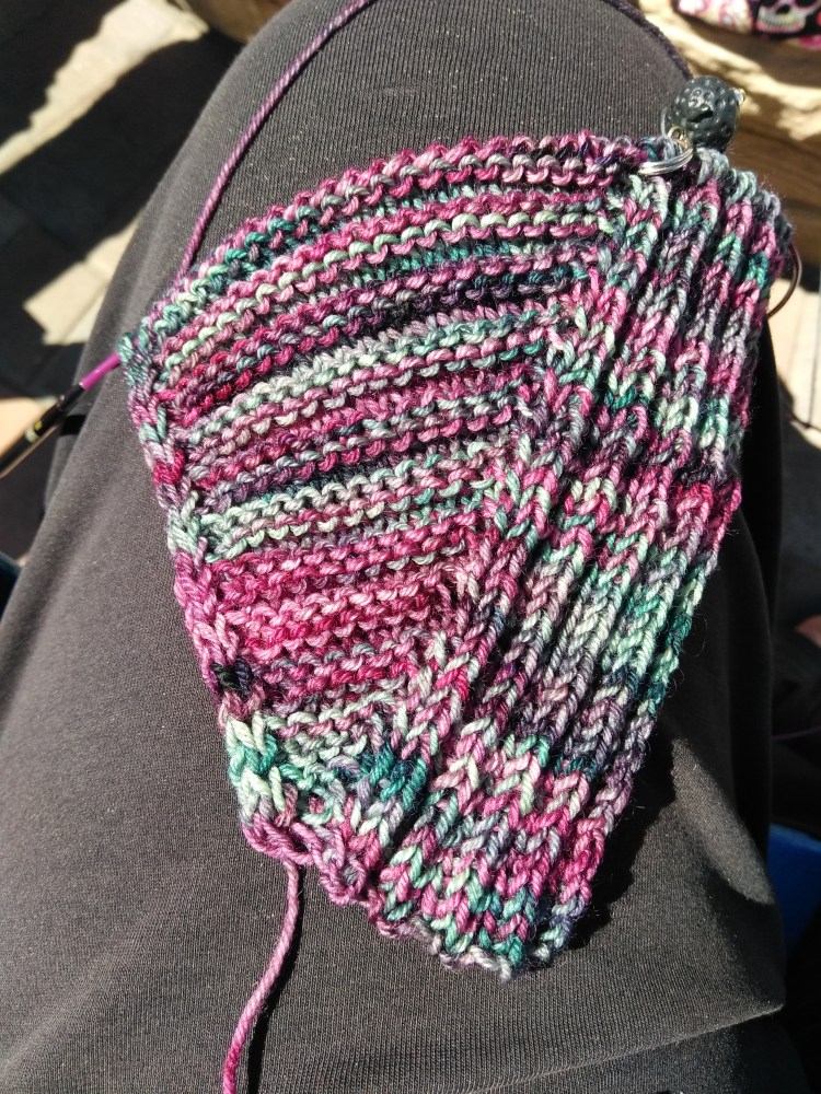 When a designer releases a new pattern sometimes they make an a-long of it and sometimes they take that one step further and make it an M(K/C)AL. The “M” is for mystery. Stephen West has done a lot of these, but he wasn’t the first designer to do this. So a mystery a-long means that you usually know what the finished item is but no idea what it looks like. You are given the materials with a lot of guidance on what colors of yarn are needed and possibly info for a swatch. You gather all your materials and then you wait for the first “clue” to drop. This could be a lot of stitching or just a little bit. I have been part of M a-longs where there is a new clue every week and even some where there was a new clue every day. These are fun. You learn new things and meet new people.