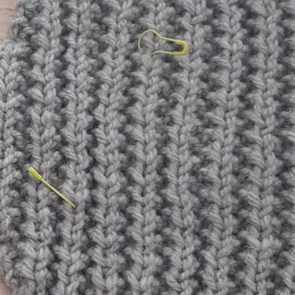 This piece here is a broken rib pattern but on the “spine” stitches you can see that every other row is knit and every other row is purled because it looks like the stitches zig-zag a bit from bottom to top.