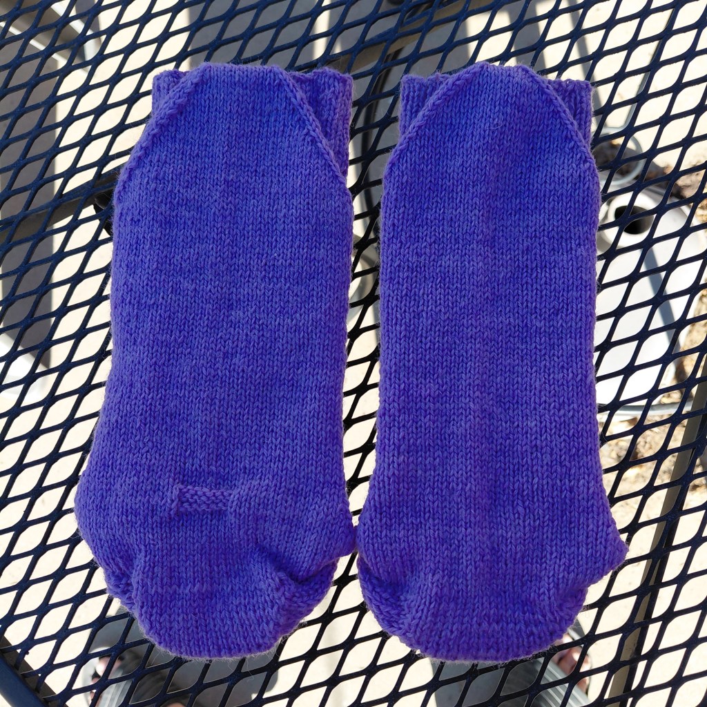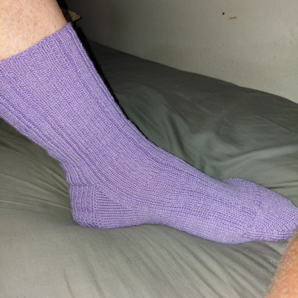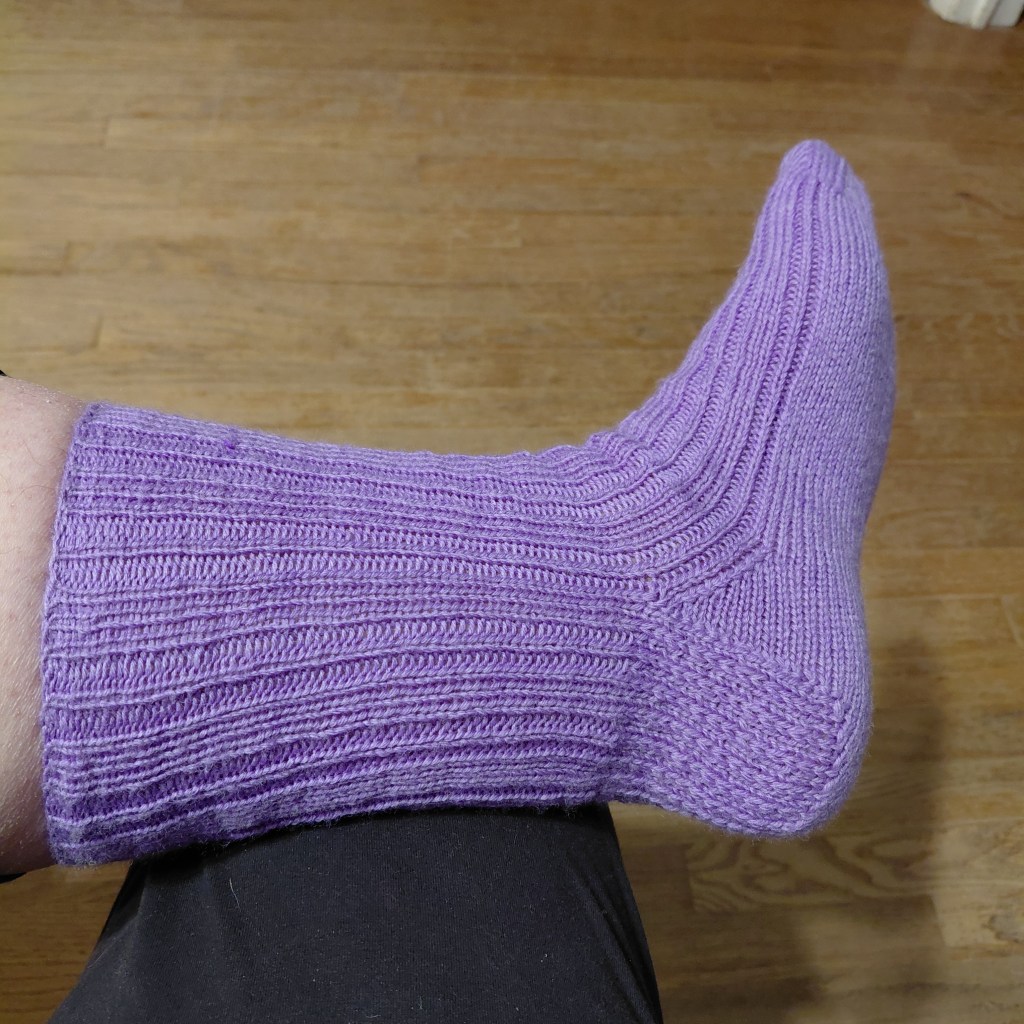 Original knit in Size 6, modeled on a 9.25” / 23.5 cm circumference foot, using 2 skeins of Brown Sheep Company, Wildfoote, in Little Lilac, 215 yds / 196 m per 50g