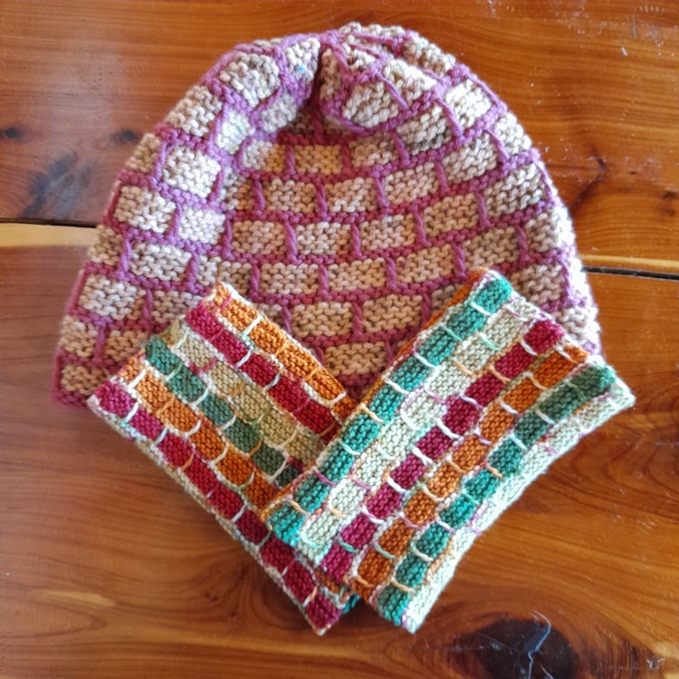 The hat is knitted using two colors of DK weight yarn and the mitts are knitted using 4 mini skeins of fingering weight yarn for the “bricks” and just a little over a mini for the “mortar”.