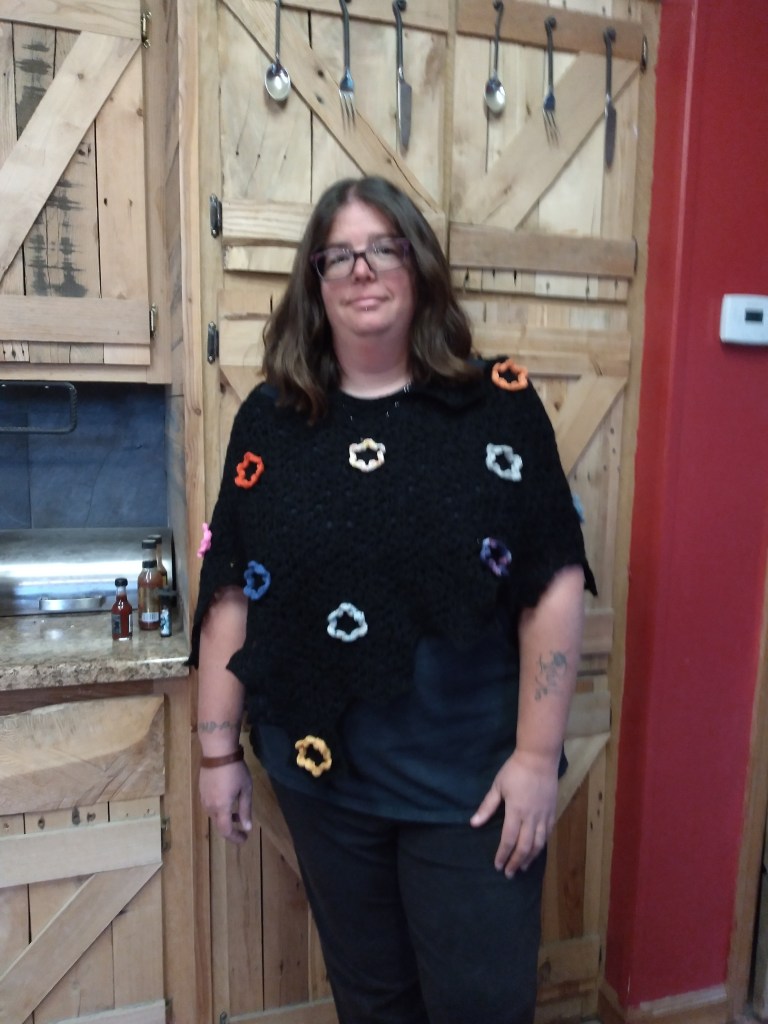 The poncho comes in 3 size options. Measure around the widest part of the shoulder to decide which size to make. 30.5” (35.25”, 40”) / 76 (88, 100)cm