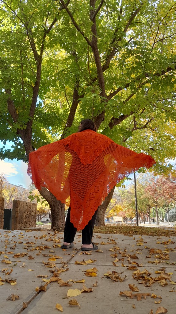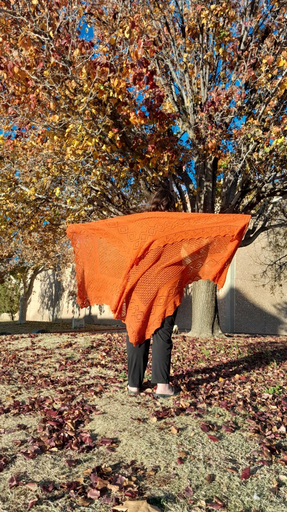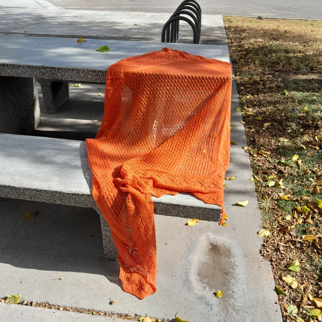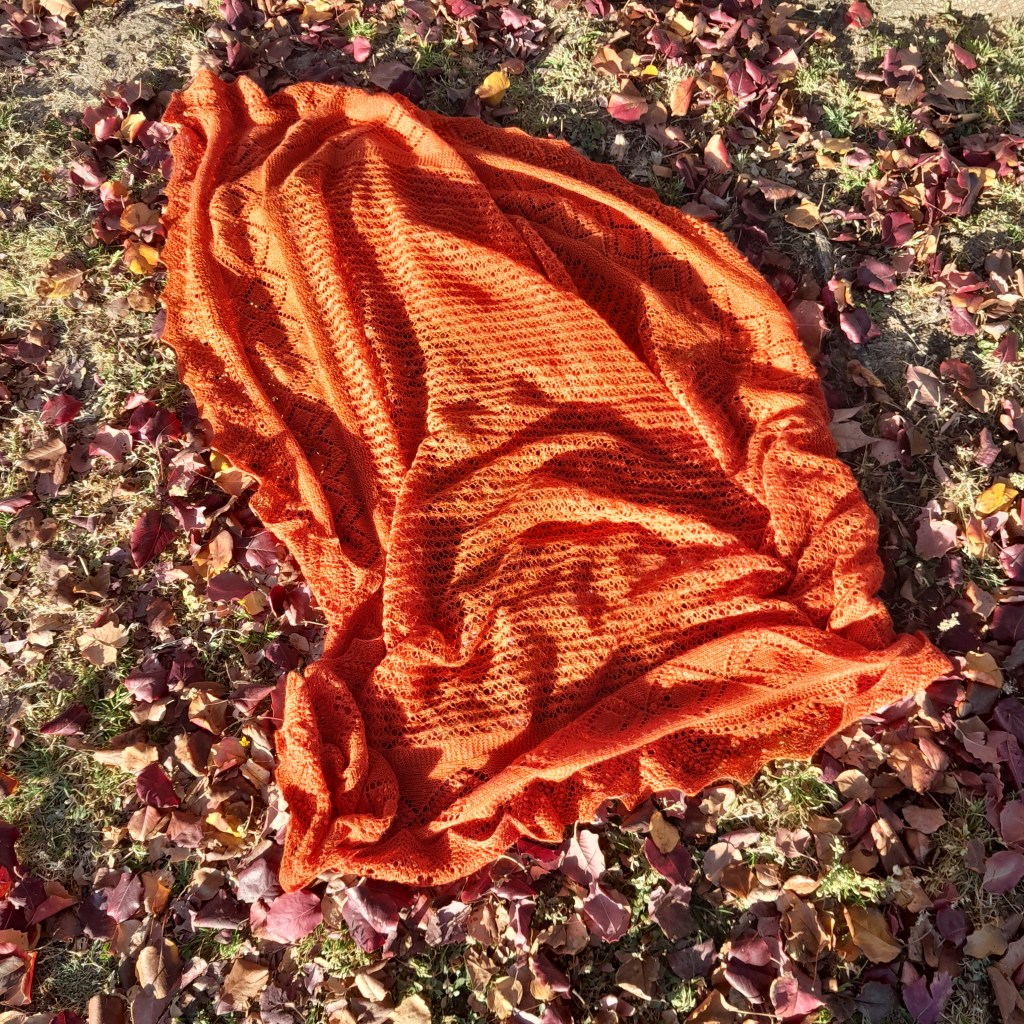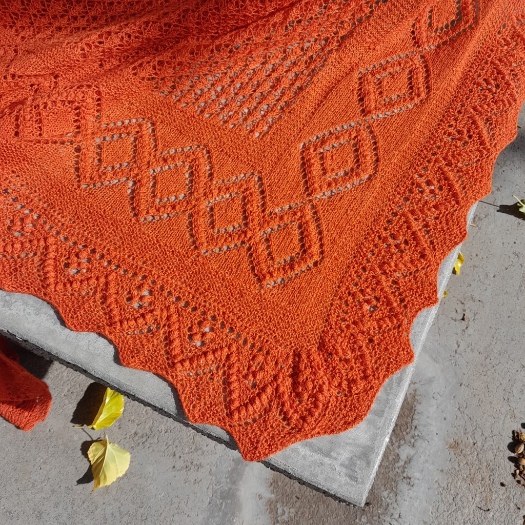 This is a traditional, authentic style Haapsalu shawl from Estonia. It wasn’t knitted in Estonia, but was designed and knitted to their standards based on info from the book “The Haapsalu Shawl”. There is a center, which is framed in garter stitch and then there is a border which is also framed in garter stitch. The Edging is worked in garter stitch on larger needles in two separate, but identical pieces and sewn onto the shawl. The Center is the “Lepatrinukiri” or ladybug stitch pattern.