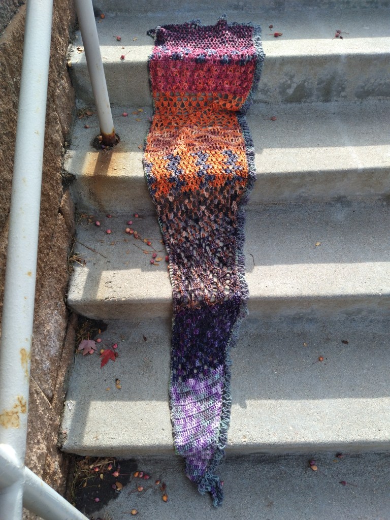 This scarf is an asymmetrical triangle that begins at the point with just one stitch. It increases from there on just one side to a nice scarf width. Then it continues evenly until all patterns are worked. Then Edged in 2 different colors and stitches.