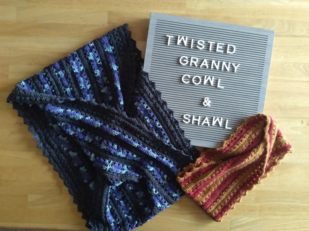 A cowl or shawl crocheted as a mobius strip from the start. The size around as well as the width of both pieces are adjustable. Start with a number of stitches that is divisible by 3.